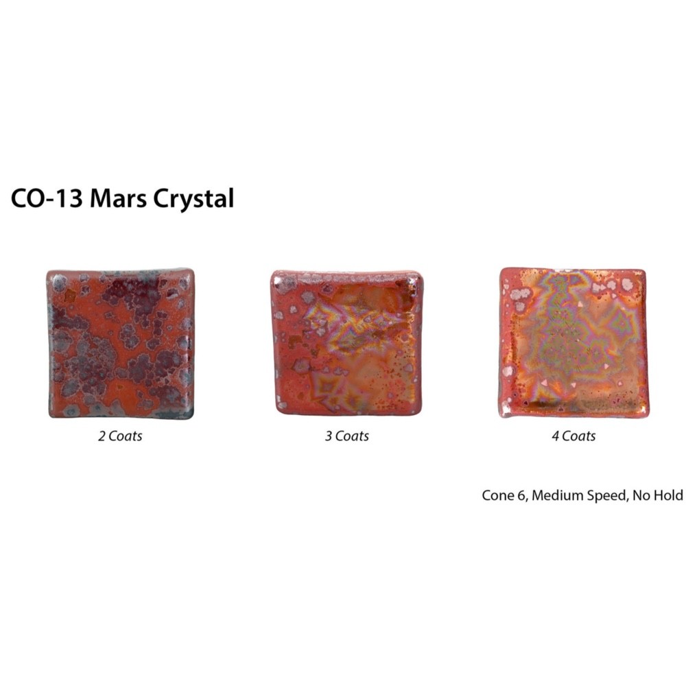 Can be fired in a normal medium-speed firing with no special cooling schedule required. To take this glaze to the next level, use a controlled cooling schedule for increased crystal growth.