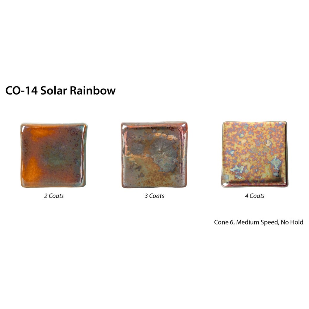 Solar Rainbow is a highly fluid, dark gloss glaze with iridescent rainbow crystals. Breaks translucent.
