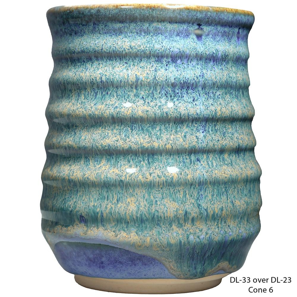 DL-23 Ultramarine is a glossy cobalt blue glaze with a lighter float. Moves when fired and breaks gray where thin. Beautiful for layering or alone.