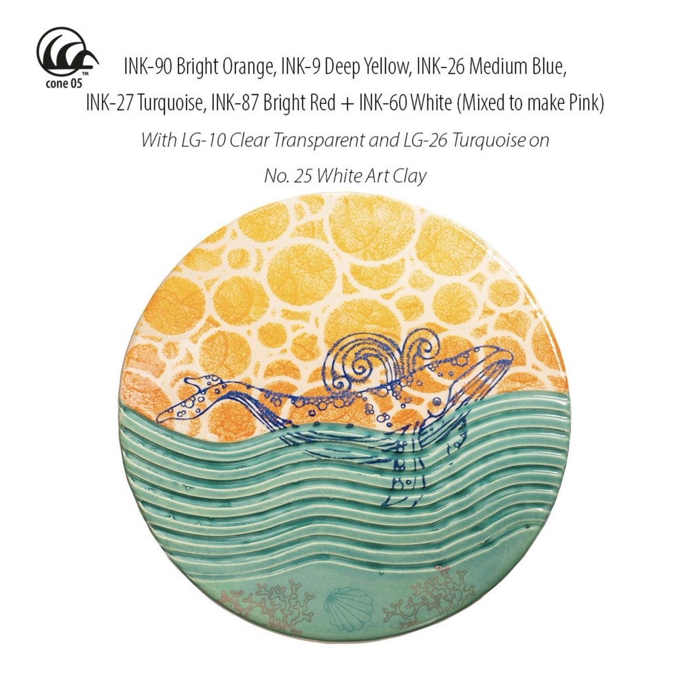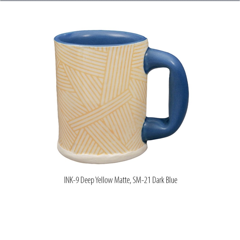 INK-09 Deep Yellow Ink is a rich ochre color that is very rich at cone 05 and is intense under a clear glaze. At cone 5, it is less saturated and becomes muted and darker at cone 10