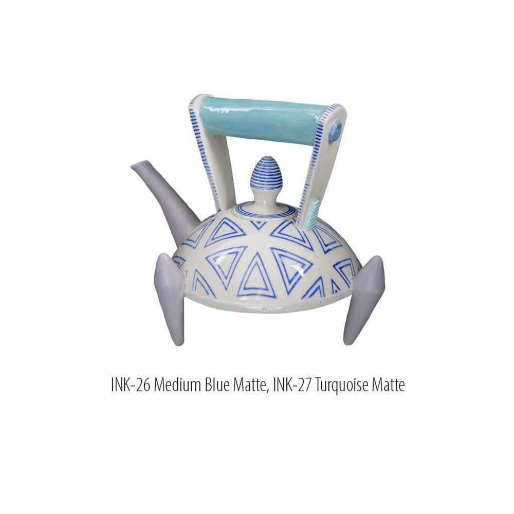 INK-27 Turquoise Matte Ink is a blue green color that is cyan at cone 05, becomes deeper cone 5, and becomes very dark at cone 10. This ink maintains its color well under a clear glaze.