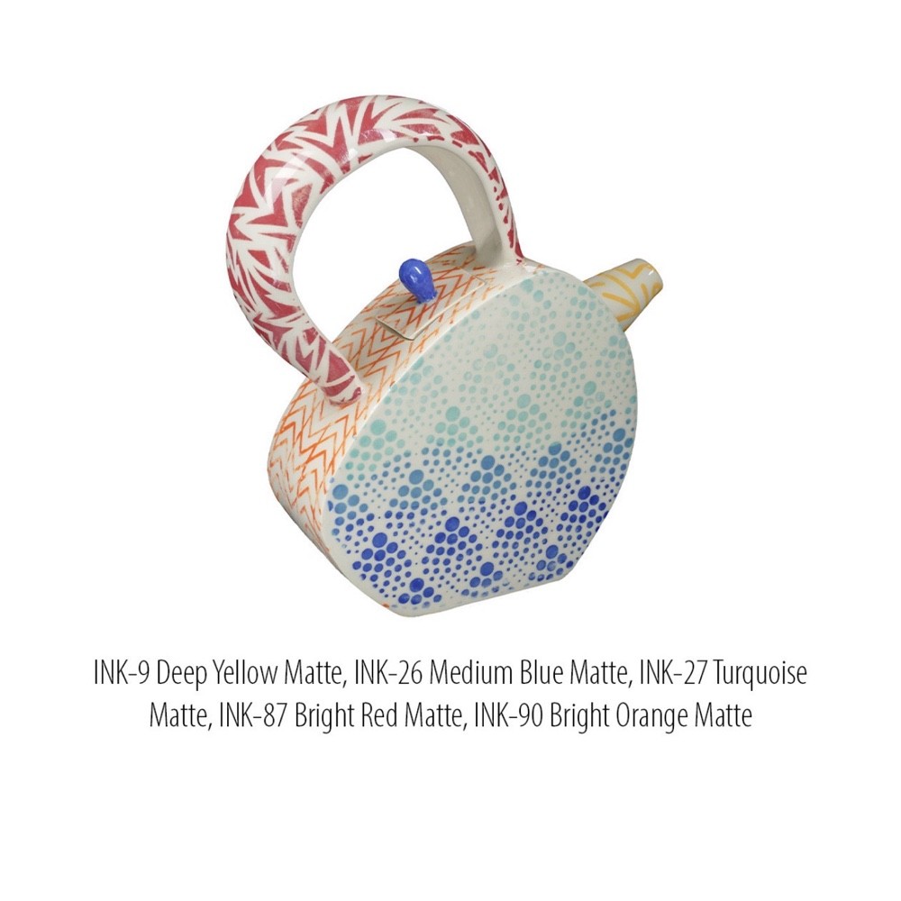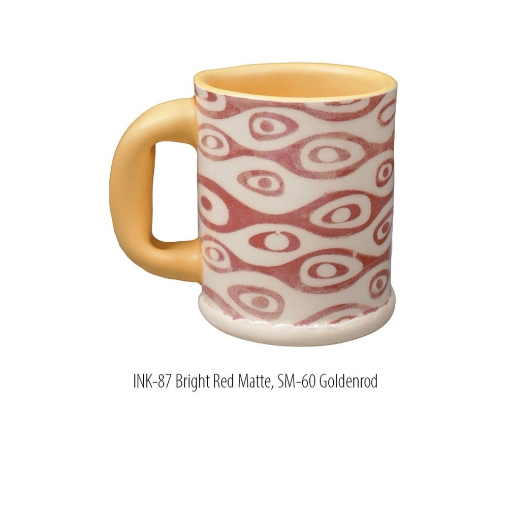Like an underglaze, this Bright Red Matte Ink fires to a matte finish that requires a clear glaze to be considered food-safe.