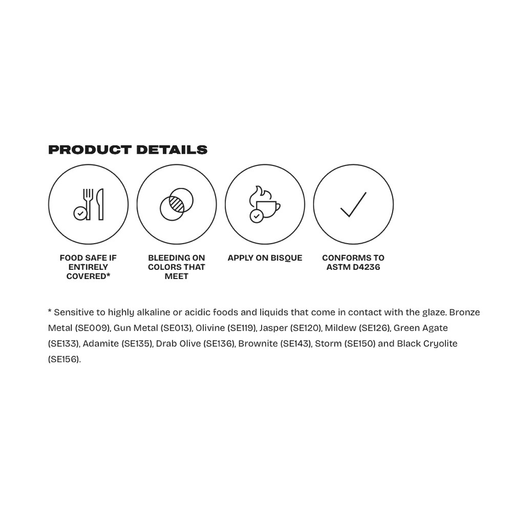 * Sensitive to highly alkaline or acidic foods and liquids that come in contact with the glaze. Bronze Metal (SE009), Gun Metal (SE013), Olivine (SE119), Jasper (SE120), Mildew (SE126), Green Agate (SE133), Adamite (SE135), Drab Olive (SE136), Brownite (SE143), Storm (SE150) and Black Cryolite (SE156).