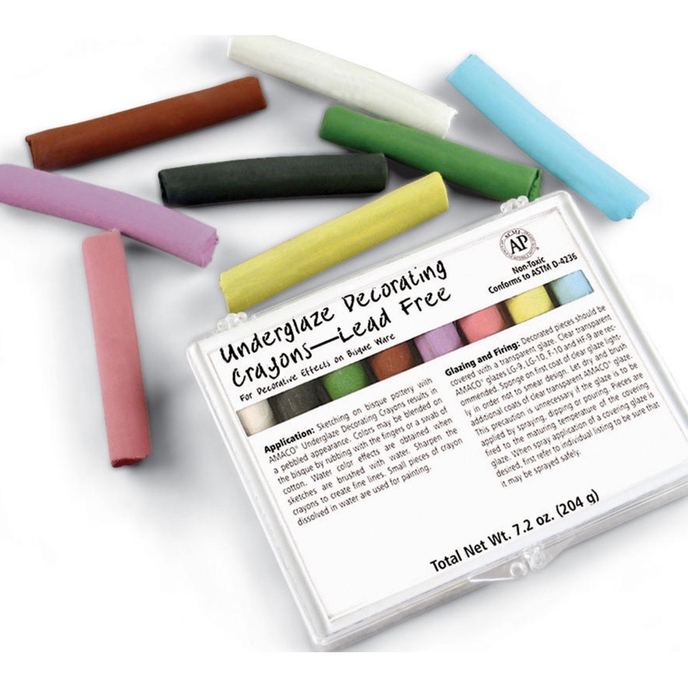 From intense hues to pastel tones, Amaco Underglaze Chalk Crayons can be used as is, sharpened for fine detail or dissolved in water for painting or spraying. Underglaze Chalk Crayon Set #209 includes Lilac, Yellow-Green, Blue-Green, Dark Brown, Medium blue, Medium Green, Light Brown, and Gray.