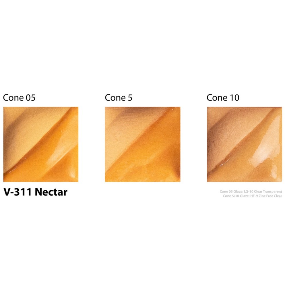 Nectar underglaze is a warm yellow color like honeysuckle flowers at cone 05 and becomes more light amber under a clear glaze. It slightly intensifies at cone 5 and cone 10.