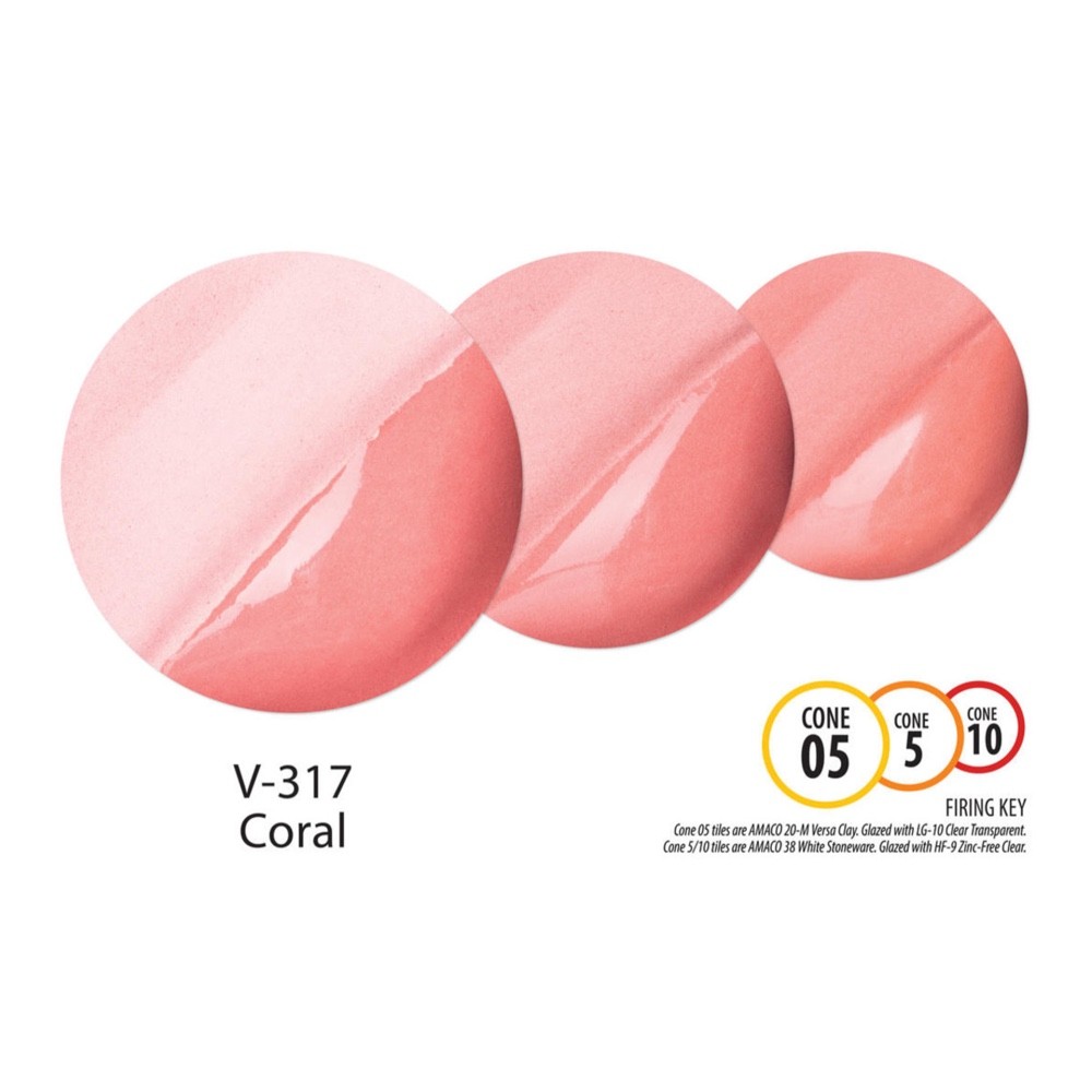 Coral is a warm, bright pink underglaze that retains color from cone 05 up to cone 10 with minimal darkening. Clear glaze brightens the color. Can be used with zinc or non-zinc glazes without color shift.