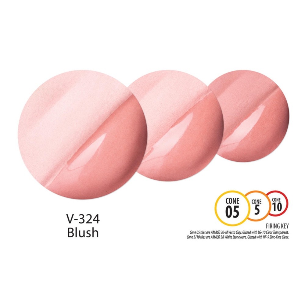 Blush is a warm, soft pink underglaze that retains color from cone 05 up to cone 10 with minimal darkening. Clear glaze brightens the color. Blush underglaze can be used with zinc or non-zinc glazes without color shift.