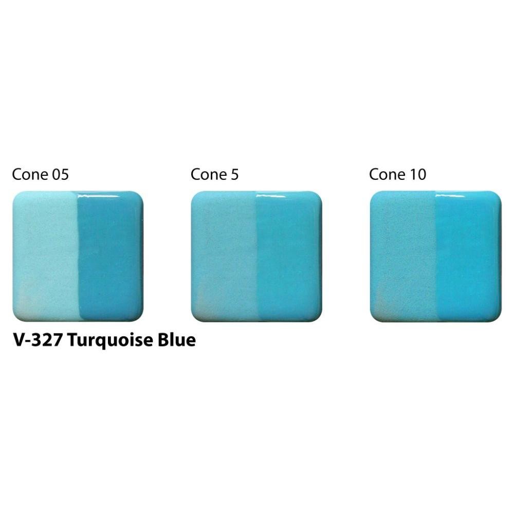 Turquoise Blue Velvet underglaze is a blue green color that is cyan at cone 05, becomes deeper cone 5, and becomes very dark at cone 10. This underglaze maintains its color well under a clear glaze at any temperature.