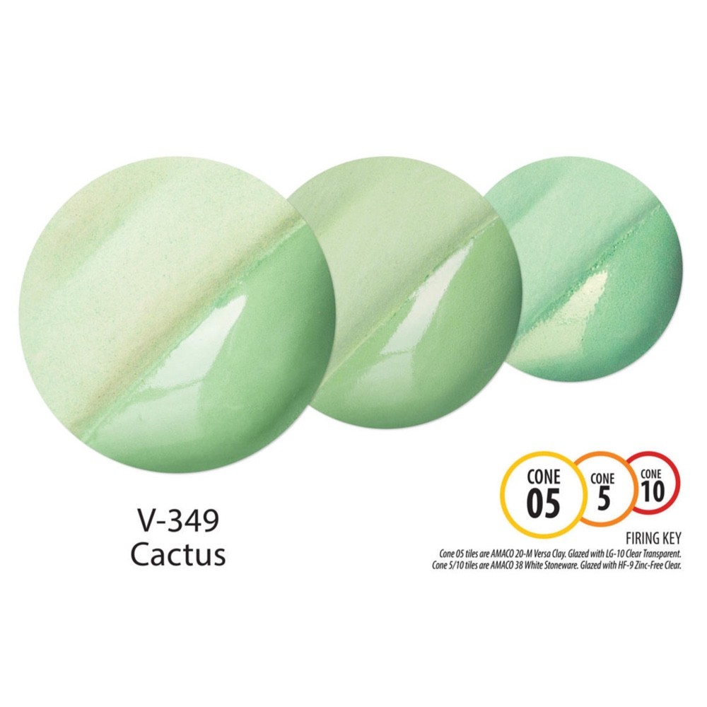 Cactus is a cool light green underglaze that retains color from cone 05 up to cone 6 with minimal darkening. Above cone 6 the color becomes slightly bluer. Clear glaze brightens the color. Cactus underglaze can be used with zinc or non-zinc glazes without color shift.