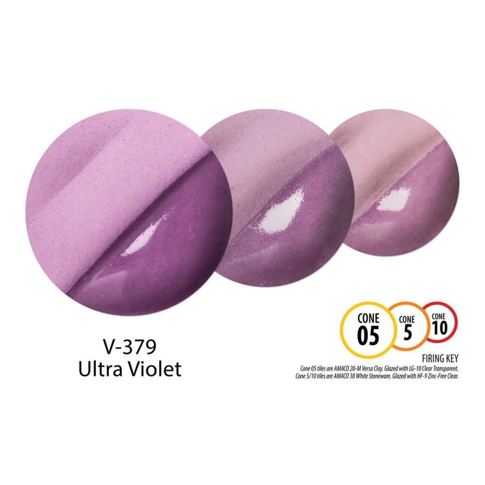 Ultra Violet Velvet Underglaze is a soft, pinkish-purple at cone 05, darkens slightly at cone 5, then lightens when fired to cone 10 but still maintains its violet shade. A clear glaze accentuates the color of the underglaze significantly at any temperature.